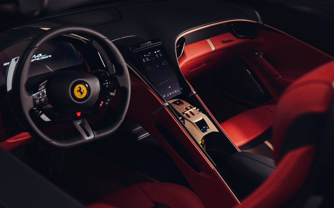페라리 로마 스파이더의 인테리어 역시 테일러 메이드를 통해 완벽하게 개인화할 수 있습니다. 가죽, 알칸타라, 카본 파이버, 우드 등 다양한 소재를 선택할 수 있으며, 각 소재는 페라리만의 고급스러운 감각으로 처리됩니다. 가죽의 색상과 질감을 선택하는 것은 물론, 스티치의 색상과 패턴까지 세밀하게 설정할 수 있습니다.
