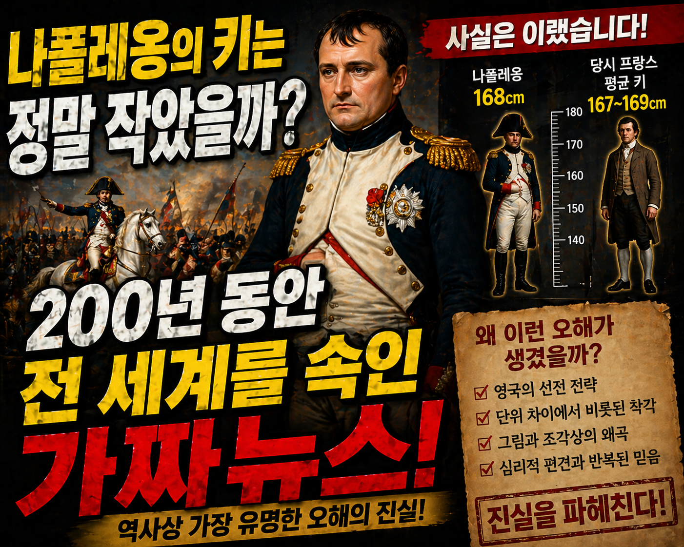 실제 나폴레옹의 키는 당시 프랑스 남성 평균과 크게 다르지 않았다는 해석이 유력해요. 오히려 그의 키가 작다는 믿음은 영국의 정치 선전, 단위 환산 오류, 후대 대중문화가 합쳐져 만들어진 거대한 가짜뉴스에 가까워요. 200년 동안 반복되며 진실처럼 굳어진 이 이야기를 하나씩 풀어보면, 역사 속 이미지가 얼마나 쉽게 조작되는지도 알 수 있어요.