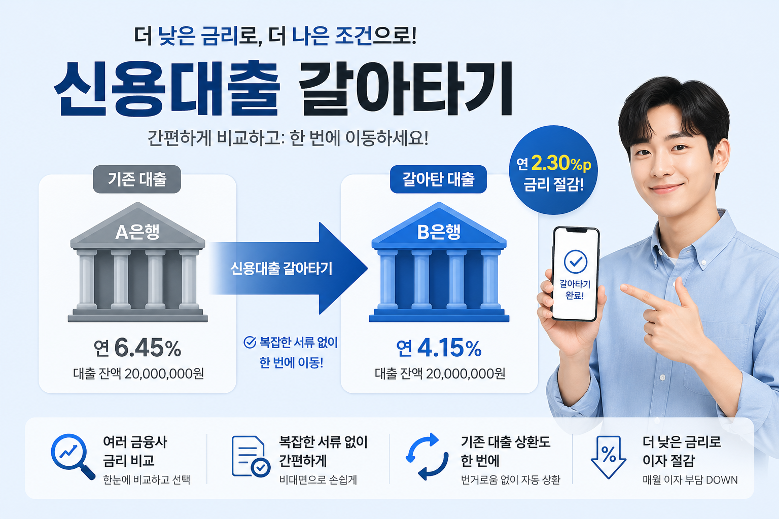 매달 빠져나가는 대출 이자가 부담된다면 신용대출 갈아타기를 검토해볼 만해요. 기존보다 낮은 금리 상품으로 옮기면 월 납입 부담을 줄일 수 있어요.