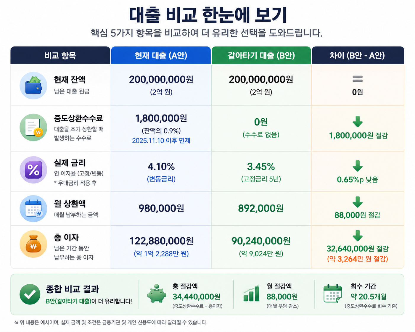 현재 잔액, 중도상환수수료, 실제 금리, 월 상환액, 총이자를 순서대로 비교해보세요.