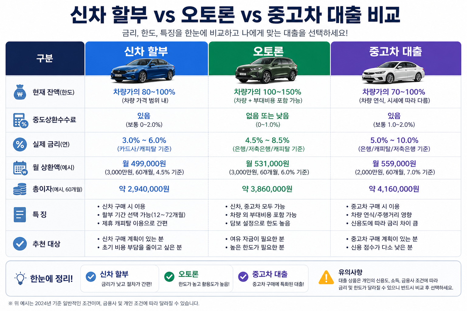 신차 할부 vs 오토론 vs 중고차 대출: 금리·총비용 완벽 비교