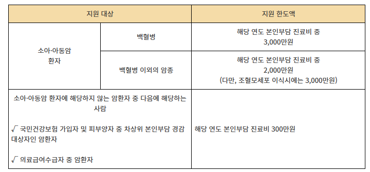 - 특정 연령대: 일부 지원금은 고령자나 소아암 환자 등 특정 연령대에 제한.