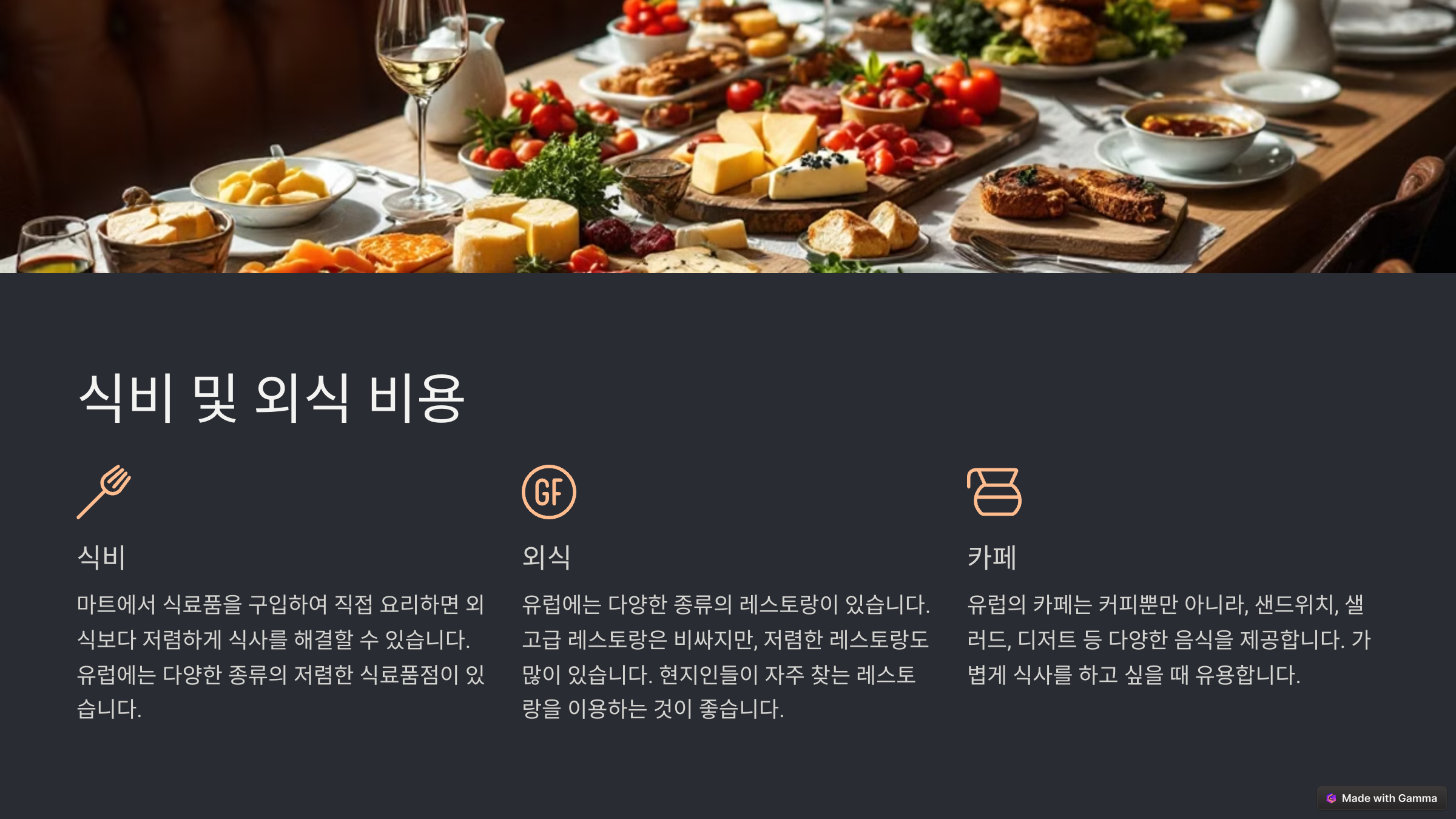 유럽 여행에서 식비는 예상보다 더 많이 들 수 있는 항목이에요. 현지 레스토랑에서 식사하면 한 끼에 €15~30 정도가 소요돼요. 하지만 저렴하게 먹을 수 있는 방법도 많답니다.