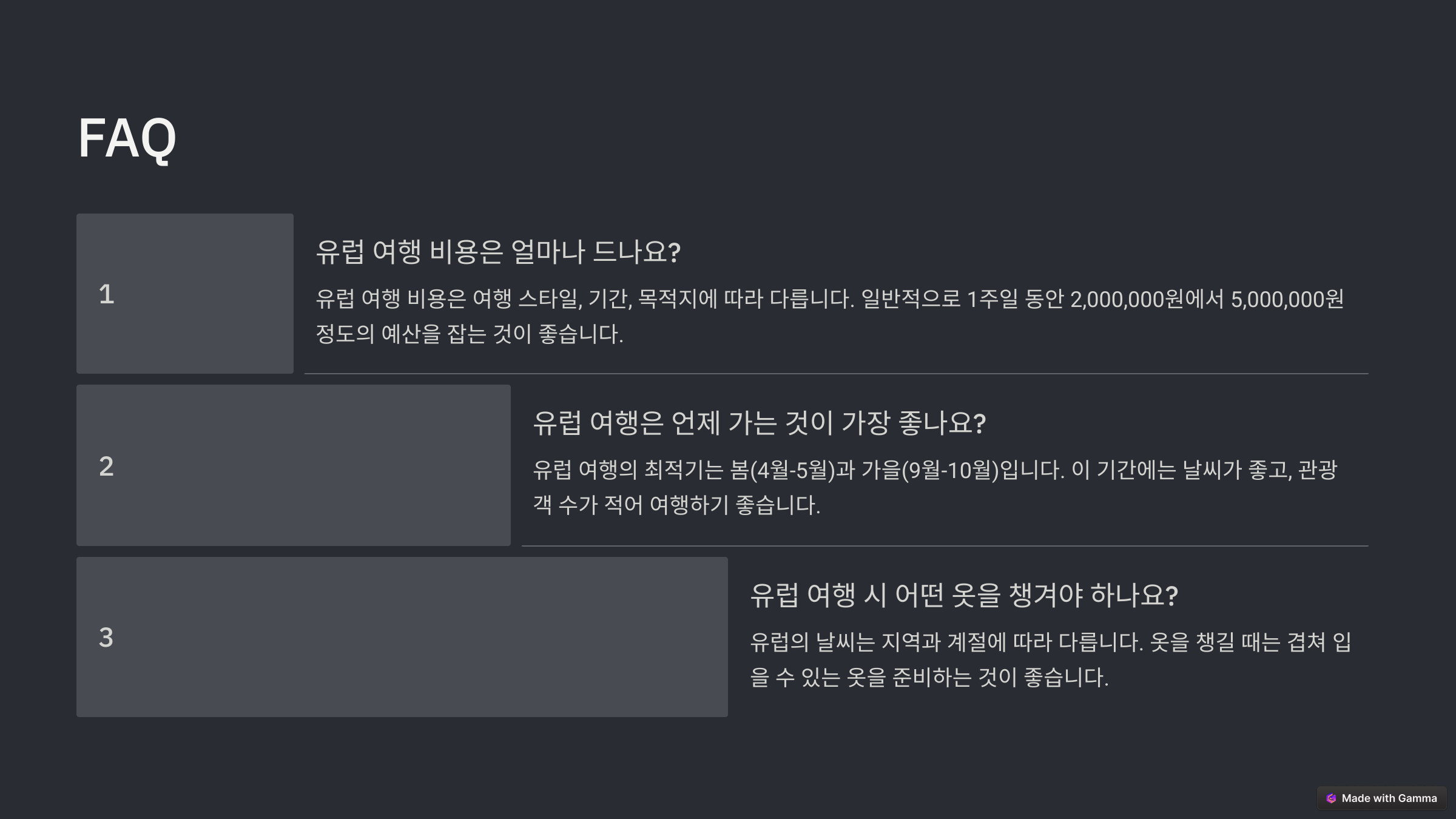 A1. 여행 스타일에 따라 다르지만, 보통 하루 €50~€150 정도 예상하면 돼요.