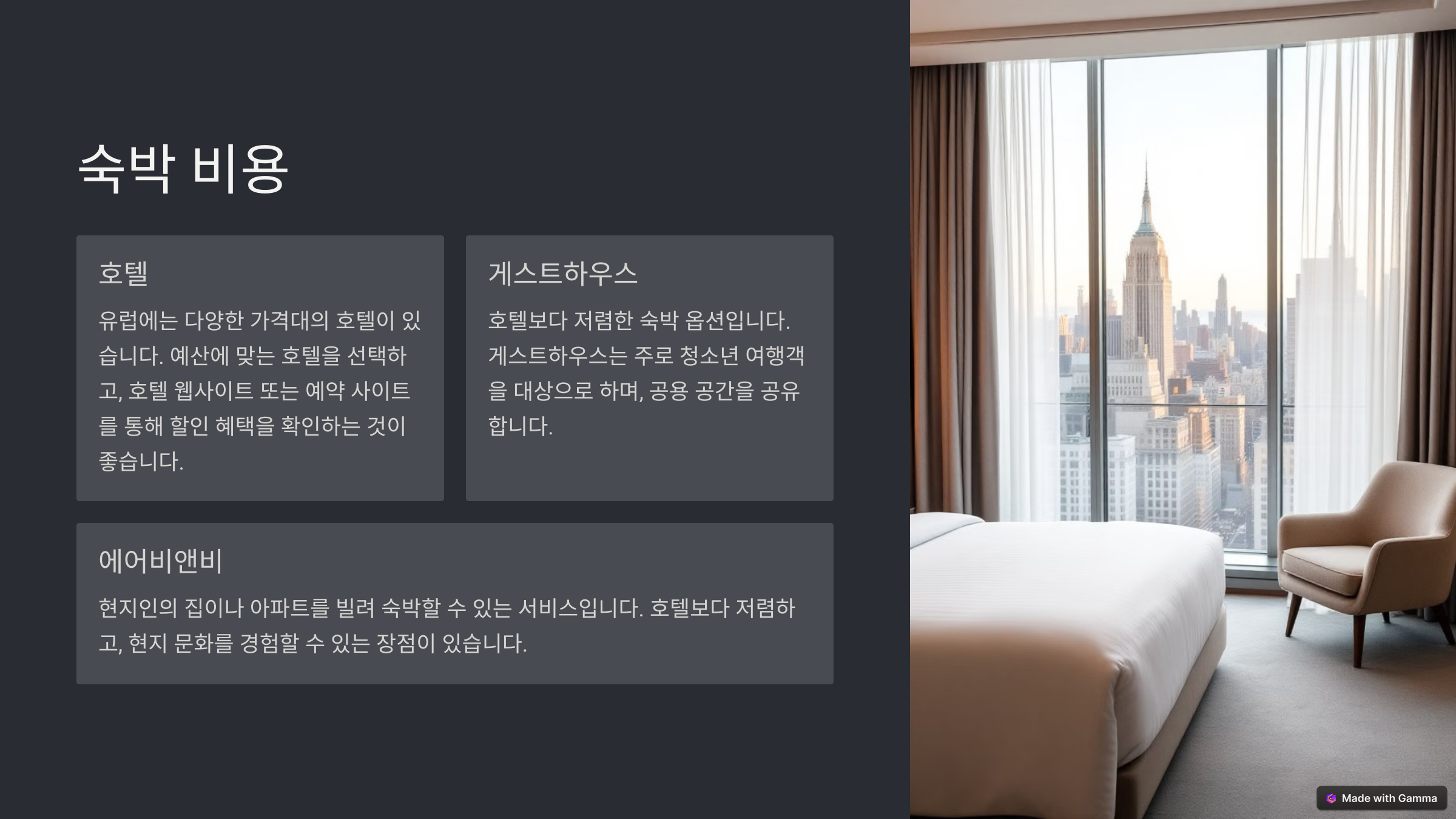 숙박비는 여행 경비에서 가장 큰 비중을 차지하는 요소 중 하나예요. 유럽에서는 다양한 숙박 옵션이 있으며, 여행 스타일과 예산에 맞춰 선택할 수 있어요.
