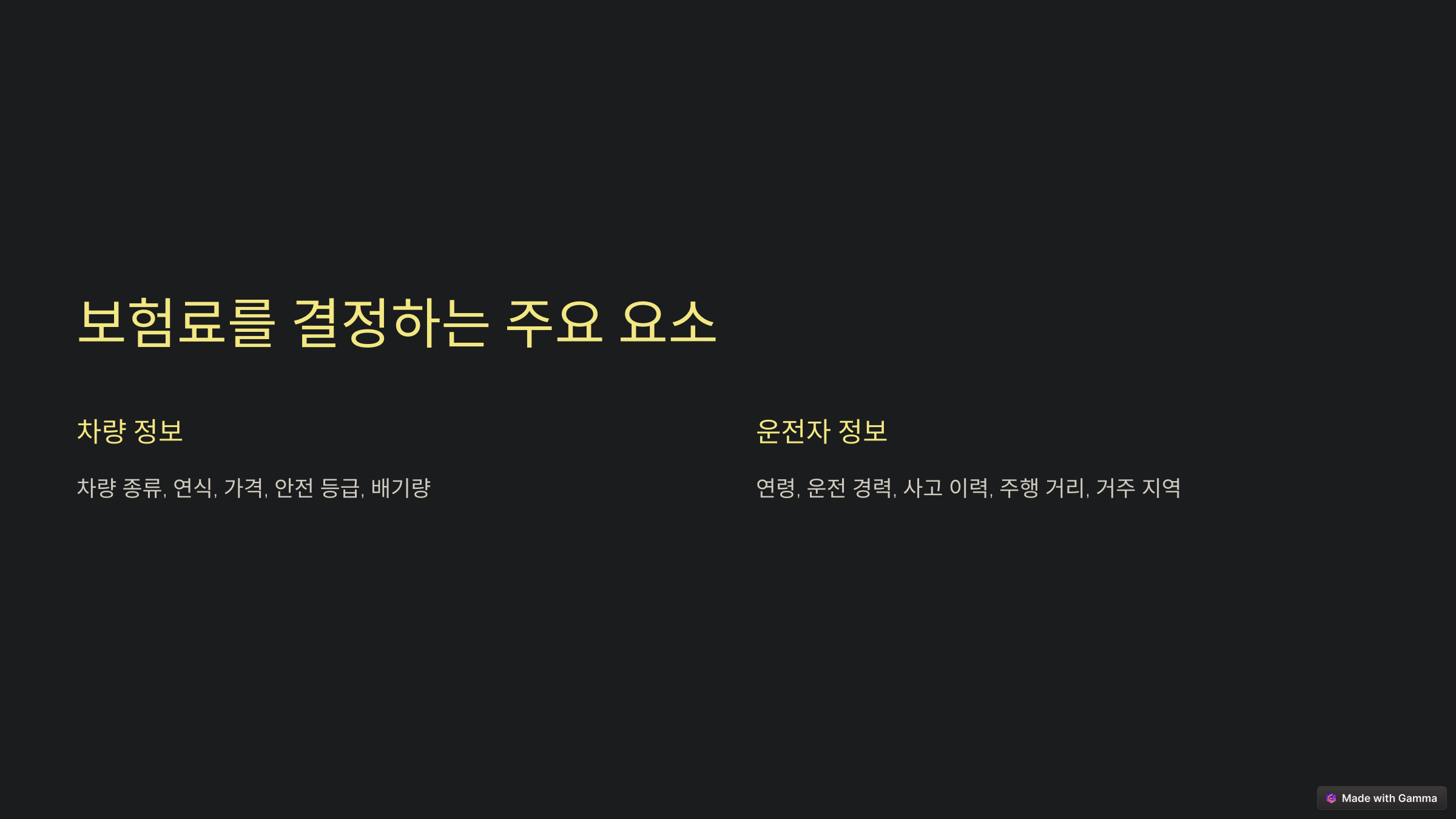 먼저, 차량 관련 요소를 살펴보면 차량의 크기나 배기량이 보험료에 영향을 줄 수 있어요. 고급 차량은 수리 비용이 비싸고 부품 교체도 까다로워 높은 보험료가 책정돼요. 반면, 소형차나 경제적인 차량은 상대적으로 낮은 보험료를 낼 가능성이 높답니다.