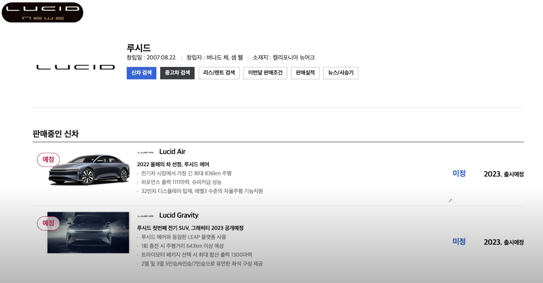 사우디 국부 펀드로부터 무려 1조 2000억 원의 자금을 지원받기도 했습니다. 첫 양산차인 ‘에어’는 첫 고객인도가 시작되었습니다. 첫 전기차인만큼 에어 퓨어는 EPA 기준 410마일(660km)의 1회 충전 주행거리를 갖추고 있습니다. 듀얼 모터 4륜 구동 파워트레은358kW (480마력)을 제공하고 있으며 3.8초 만에 정지 상태에서 시속 100km를 가속할 수 있습니다.